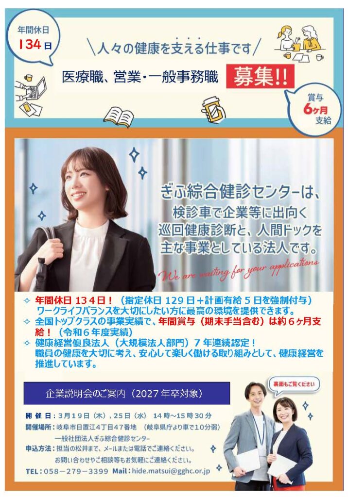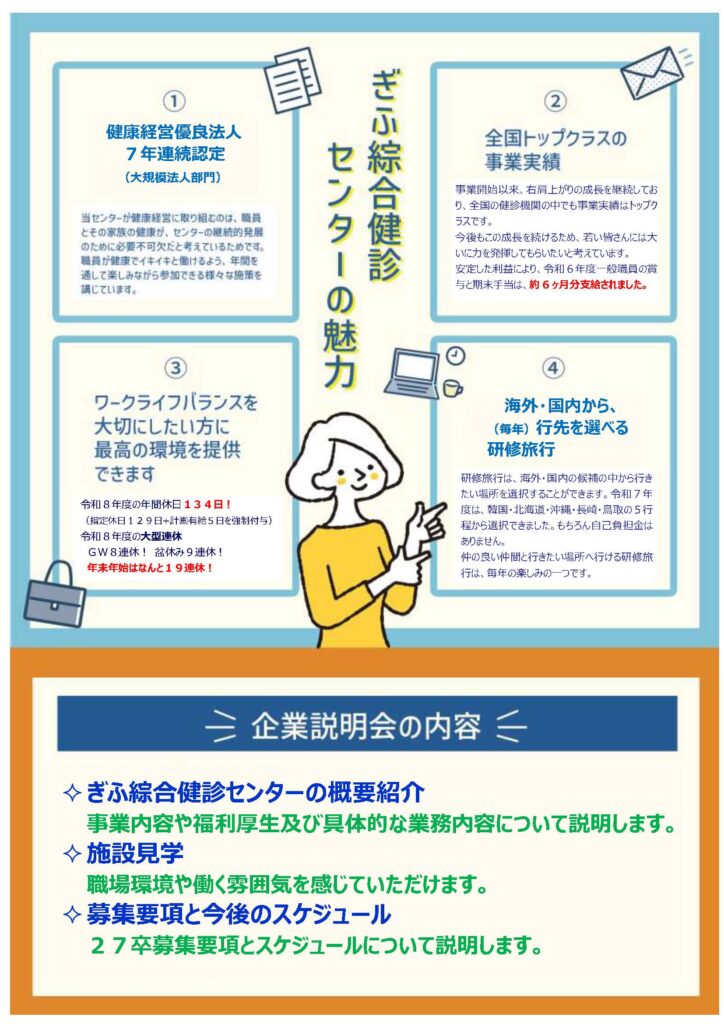 説明会では、弊センターの概要と27卒の募集要項等を説明いたしますので、就職活動の情報収集にお役立てください。